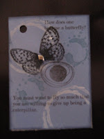 Another swap went out in the mail this morning. The theme was diet. I had to incorporate a hole in the corner of my card so that the cards can be hung from a ring that can be carried with you. The lady who is hosting the swap mentioned that people were making two sets of nine so of course I had to make two as well. The first set has a little fit file that opens to reveal treasures like my before and after picture, one of my favorite weight loss quotes right now, "You have to love yourself enough to keep the weight off.", and a little fortune that you can find in some pay scales. This along with somw glitter and it was good to go. The second set had another of my favorite quotes, "How does one learn to fly? You have to want to fly so much that you are willing to give up being a caterpillar ." and the back says, "What is your goal? Take one day at a time. Believe that anything is possible." The front was stamped with my circle stamps and finally I added a clear acetate butterfly with a silver brad and pulled up the wings so it looks like it is flying off the page. I can't wait to see what comes back in mid November.